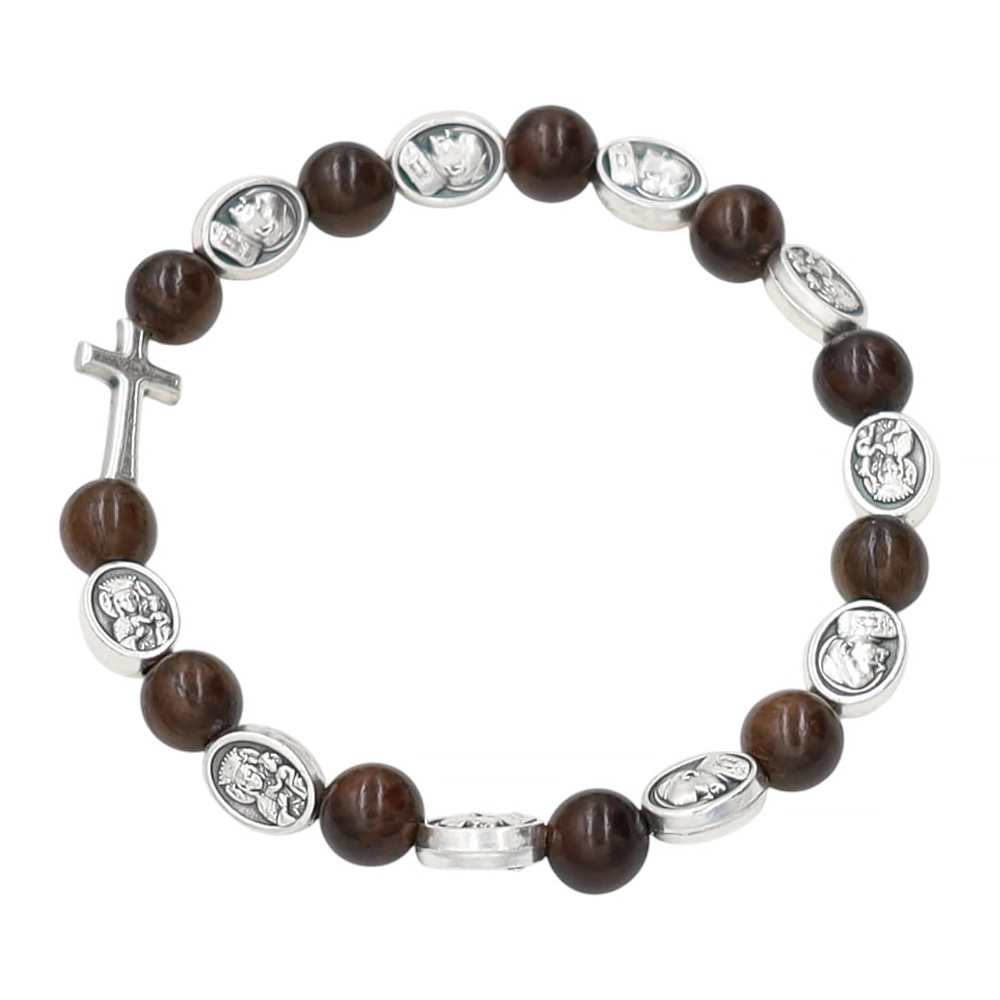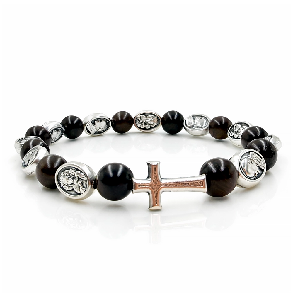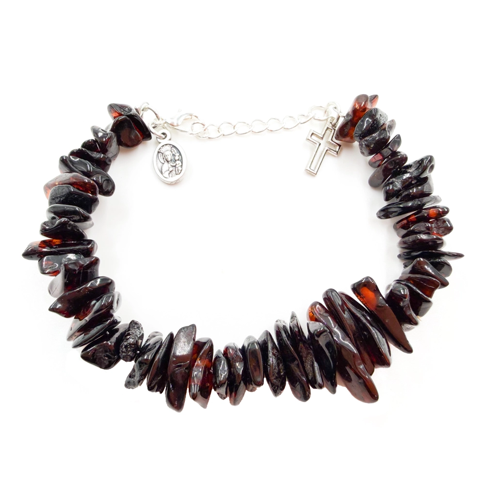 Bransoletka wykonana z drewna gruszy chińskiej z krzyżem i medalikami to symbol wiary, który idealnie nadaje się do codziennego noszenia.