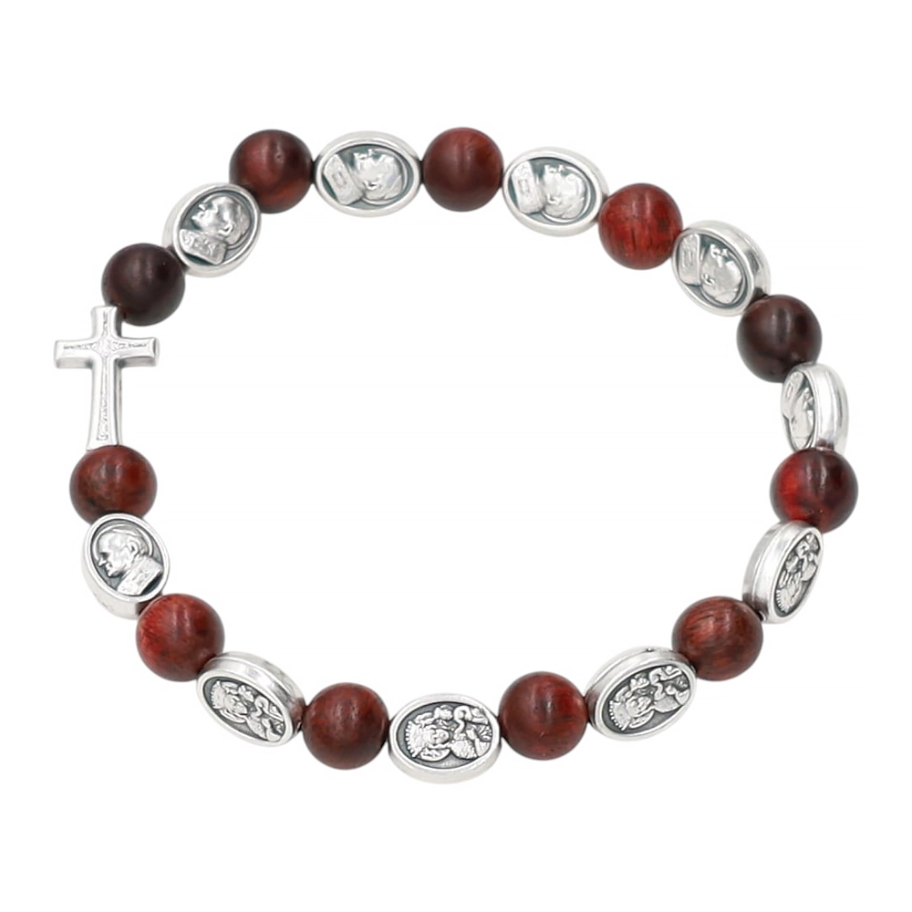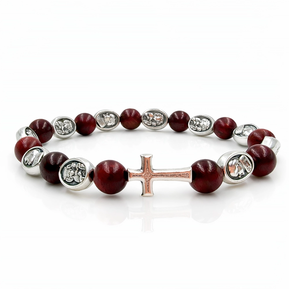 Naturalne drewno mahoniowe, dwustronne medaliki oraz krzyż tworzą spójną, stylową i duchowo bogatą bransoletkę, która subtelnie łączy elegancję z wiarą.