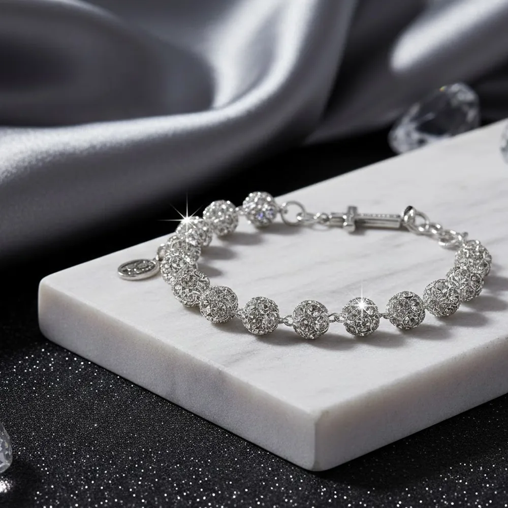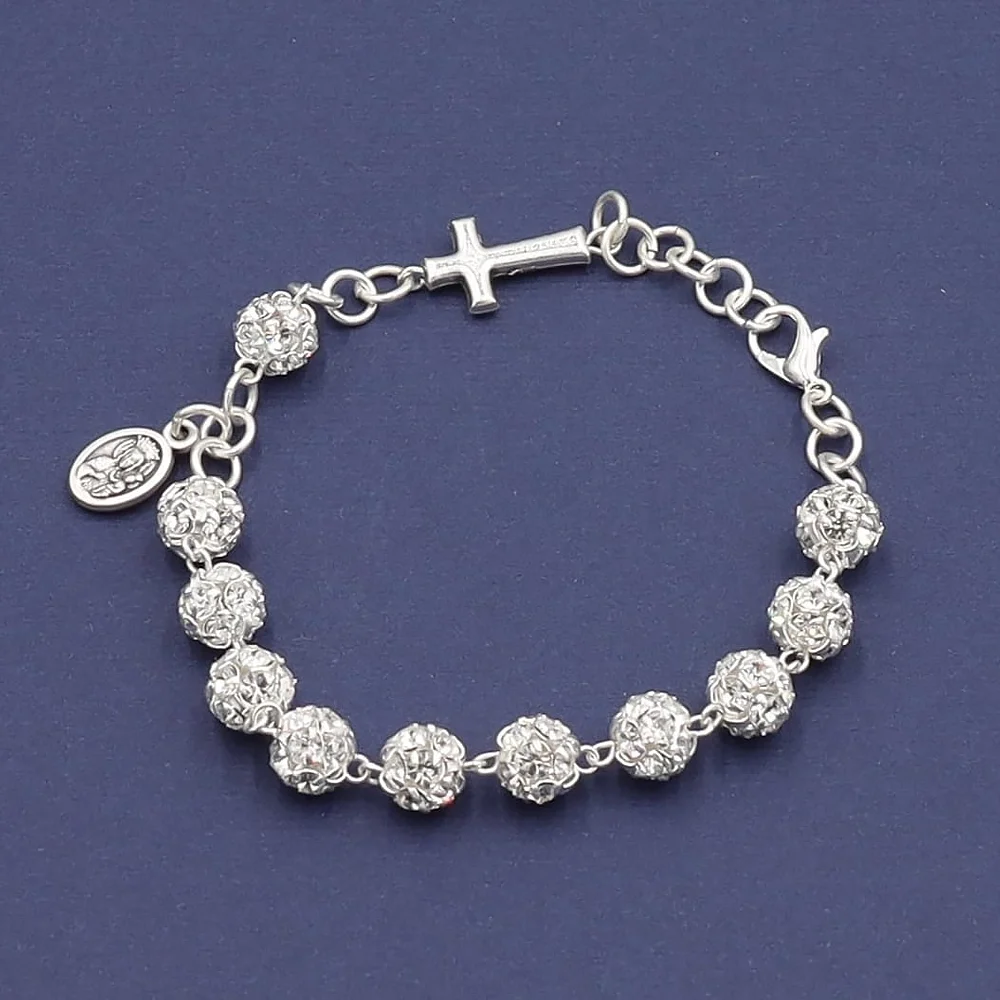Bransoletka wykonana z białych kryształków preciosa z krzyżem to symbol wiary, który idealnie nadaje się do codziennego noszenia.