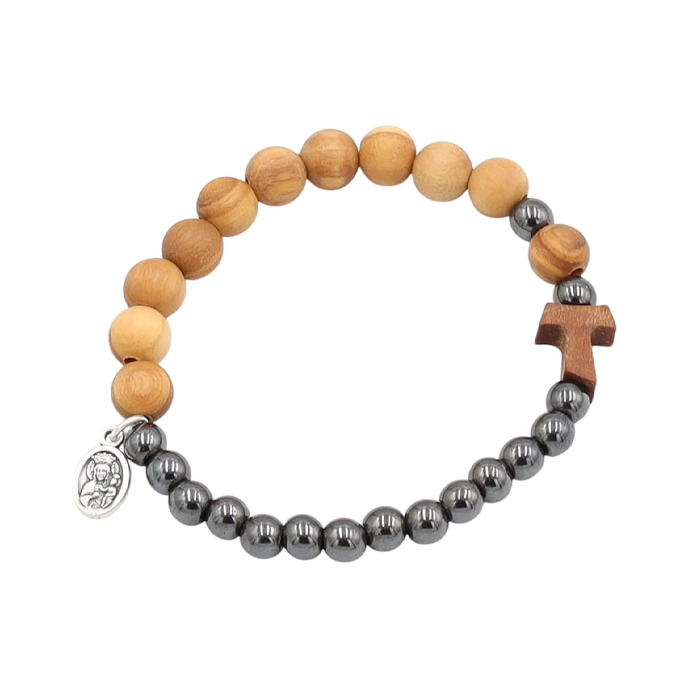 Bransoletka wykonana z drewna oliwnego i hematytu z krzyżem to symbol wiary, który idealnie nadaje się do codziennego noszenia.