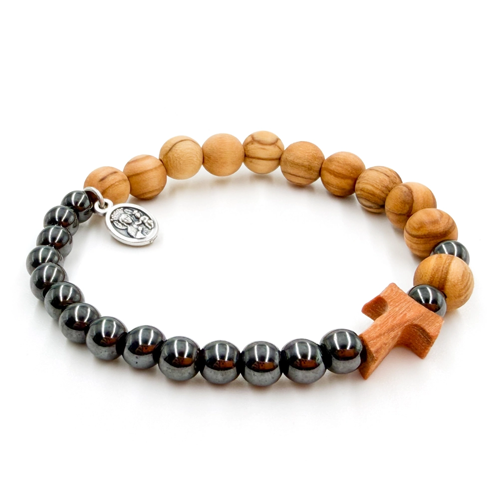 Bransoletka z drewna oliwnego 8 mm i hematytu 6 mm to wyjątkowa biżuteria, która łączy naturalne materiały z głęboką symboliką religijną. Ciepły odcień drewna oliwnego harmonijnie współgra z eleganckim połyskiem hematytu, tworząc ponadczasowy i stylowy dodatek na co dzień oraz na wyjątkowe okazje.