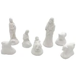Komplet 7 figur odlanych z gipsu, w kolorze śnieżnej bieli. Najwyższa postać ma 12 cm, a całość tworzy elegancką i harmonijną scenę Bożego Narodzenia.