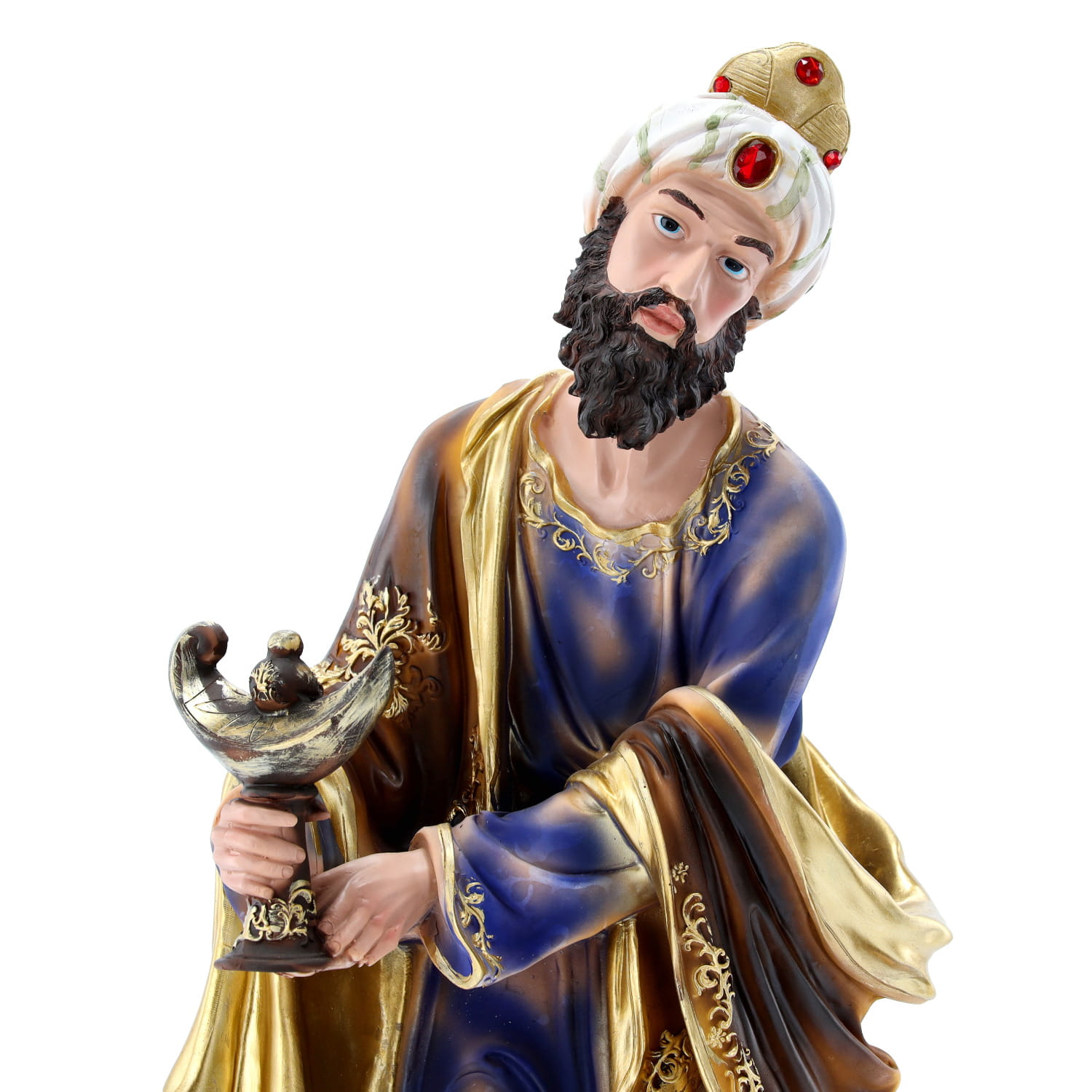 Komplet 11 figur odlanych z trwałej żywicy, malowanych w naturalne barwy. Najwyższa postać ma 80 cm, a całość tworzy elegancką i harmonijną scenę Bożego Narodzenia.