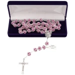 Różaniec zapakowany jest w eleganckie etui flokowane w kolorze czerwonym lub szafirowym, co czyni go idealnym prezentem o duchowym znaczeniu oraz zapewnia estetyczne i bezpieczne przechowywanie.