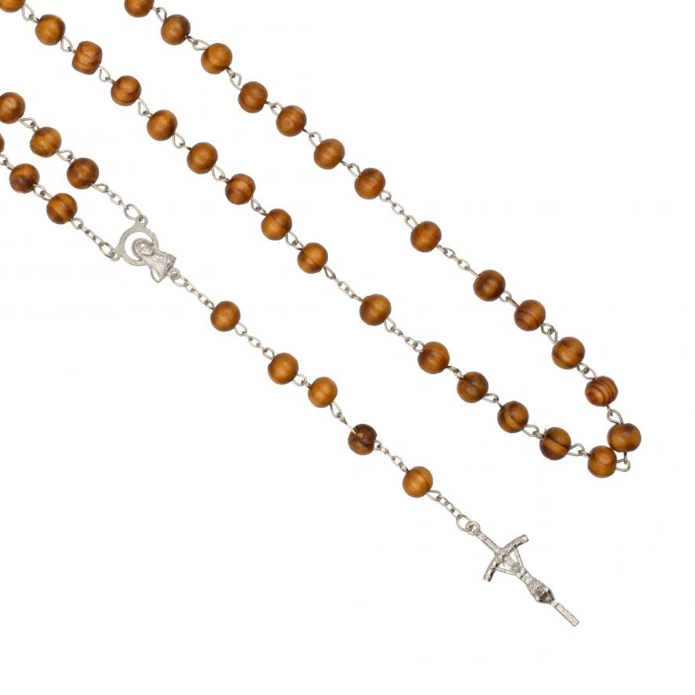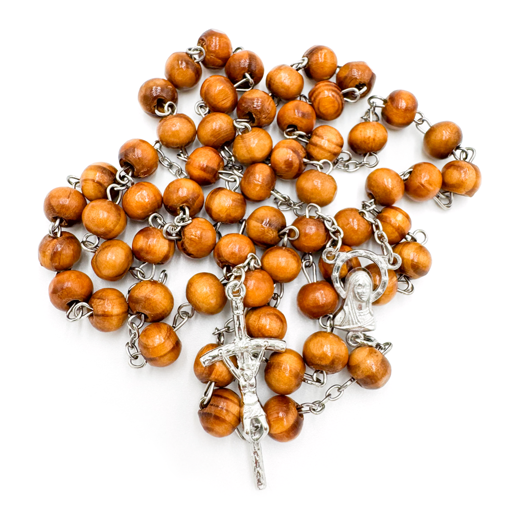 Koraliki 8 mm, drewniany krzyżyk 4 x 1,7 cm, długość całkowita 53 cm. Wyjątkowy dodatek do codziennej modlitwy, z wizerunkiem Maryi, łączący naturalne piękno drewna i duchową głębię.