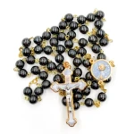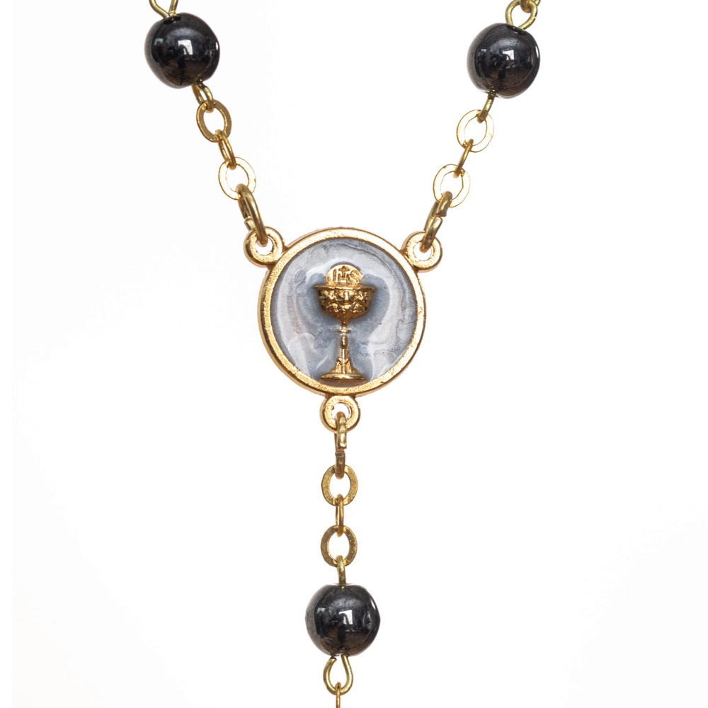 Połączenie hematytu, masy perłowej i złotych podzespołów sprawia, że różaniec ten jest nie tylko narzędziem modlitwy, ale także wyjątkowym znakiem wiary, skupienia i duchowej harmonii.