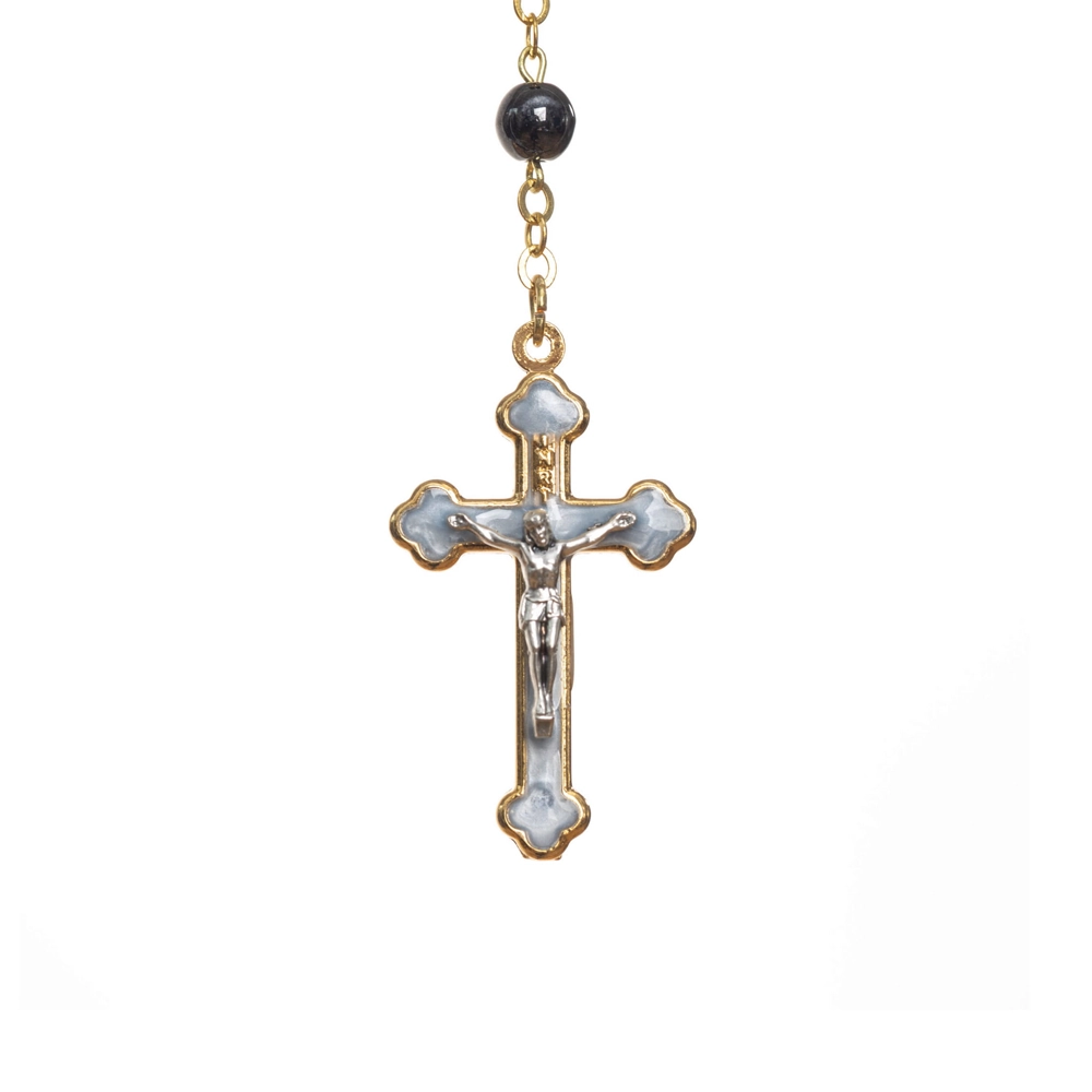 Krzyżyk oraz łącznik różańca zostały wykonane z masy perłowej, której delikatny blask pięknie kontrastuje z ciemnym hematytem. Te elementy podkreślają elegancję różańca i nadają mu wyjątkowej lekkości oraz duchowej symboliki.