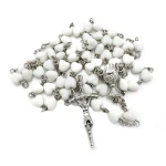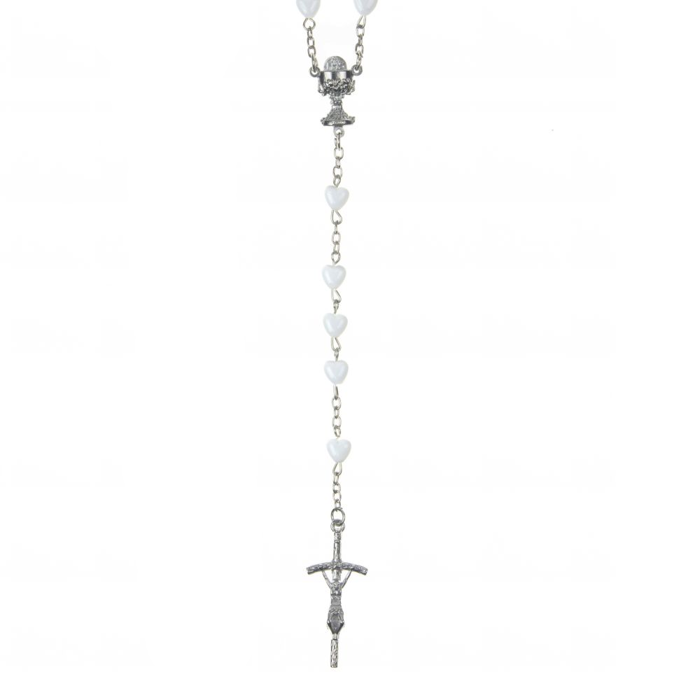 Delikatny różaniec o długości 52 cm z koralikami w kształcie serc 6 x 6 mm, eleganckim krzyżykiem 3,5 x 1,5 cm oraz medalikiem z symbolem IHS. Idealna pamiątka Pierwszej Komunii Świętej, symbolizująca czystość i duchową miłość.