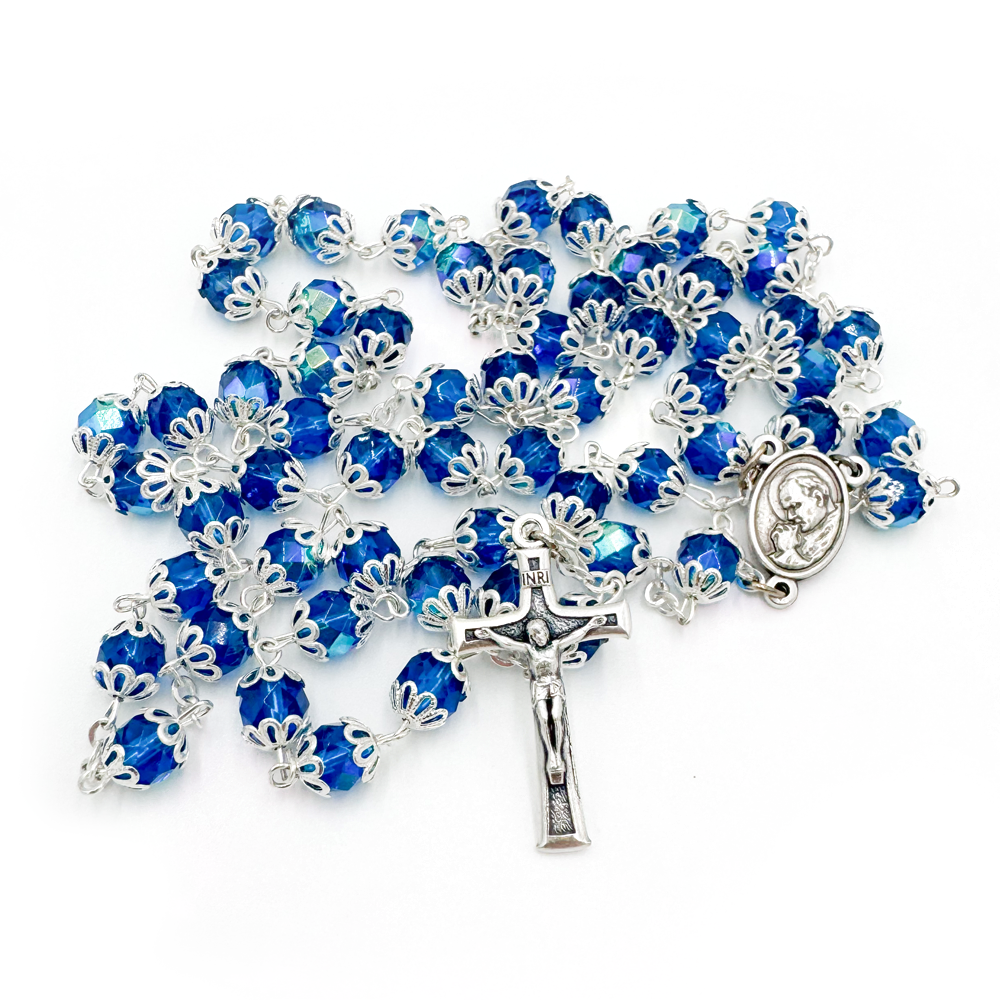 Różaniec kryształowy z kapturkiem w odcieniu niebieskim to połączenie wyjątkowego blasku, solidnego wykonania i duchowej głębi. Każdy kryształowy koralik o średnicy 7 mm został osadzony w ozdobnym, metalowym kapturku, co nadaje różańcowi bardziej masywny i prestiżowy wygląd.