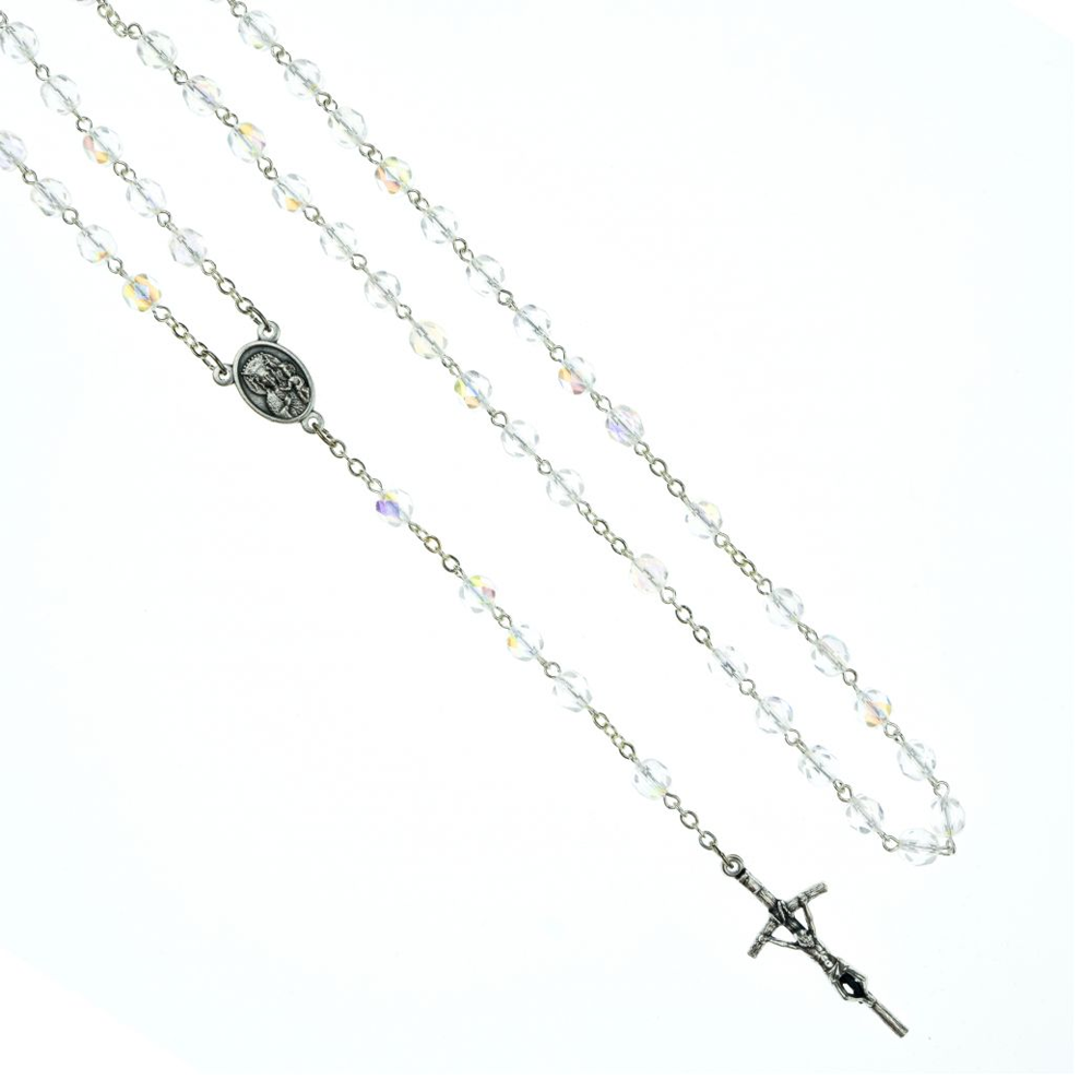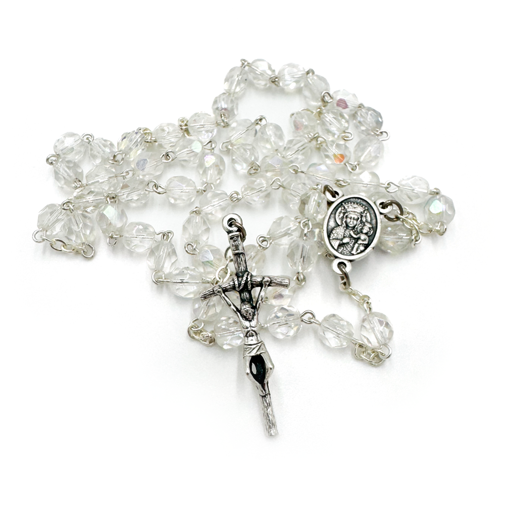 Elegancki różaniec o długości 46 cm z kryształkami 6 mm, które pięknie mienią się w świetle. Wyposażony w dwustronny medalik z Matką Boską i Janem Pawłem II oraz krzyżyk 4 x 1,5 cm. Idealny do modlitwy i na wyjątkowy prezent.