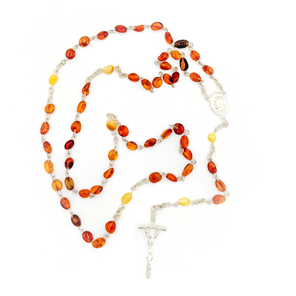 Każdy różaniec, dzięki naturalnym odcieniom bursztynu, jest niepowtarzalny. Połączenie prostoty formy, wysokiej jakości wykonania i duchowej symboliki sprawia, że ten różaniec z bursztynu wyróżnia się wyjątkową estetyką.