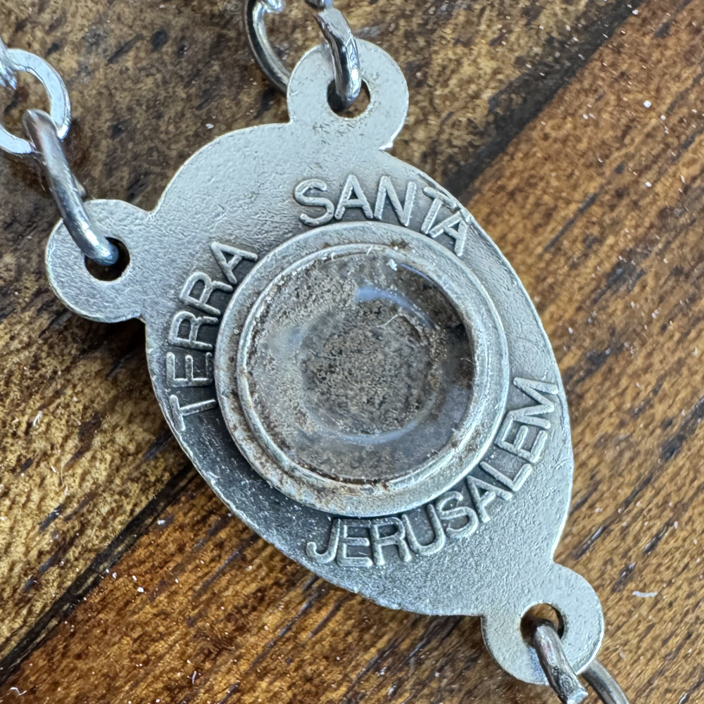 Koraliki 7 x 5 mm, metalowy krzyżyk 4 x 1,7 cm, długość całkowita 49 cm. Z medalikiem z wizerunkiem Matki Boskiej i Ziemią Świętą, idealny do codziennej modlitwy i refleksji duchowej.