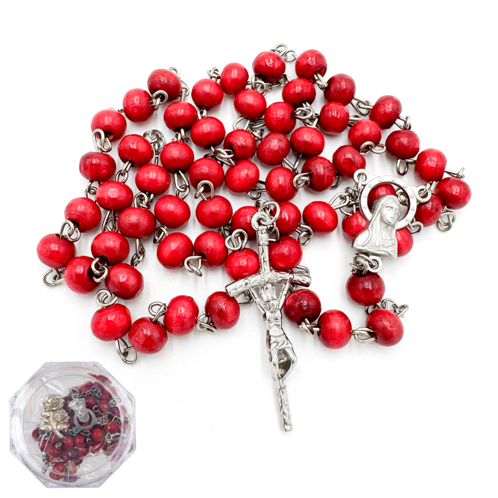 Piękny, trwały różaniec o długości 49 cm z koralikami 6 mm o intensywnym zapachu róży. Dwustronny medalik z Matką Boską i krzyżyk 3,5 x 1,5 cm. Zapakowany w eleganckie okrągłe pudełko, idealny na prezent.