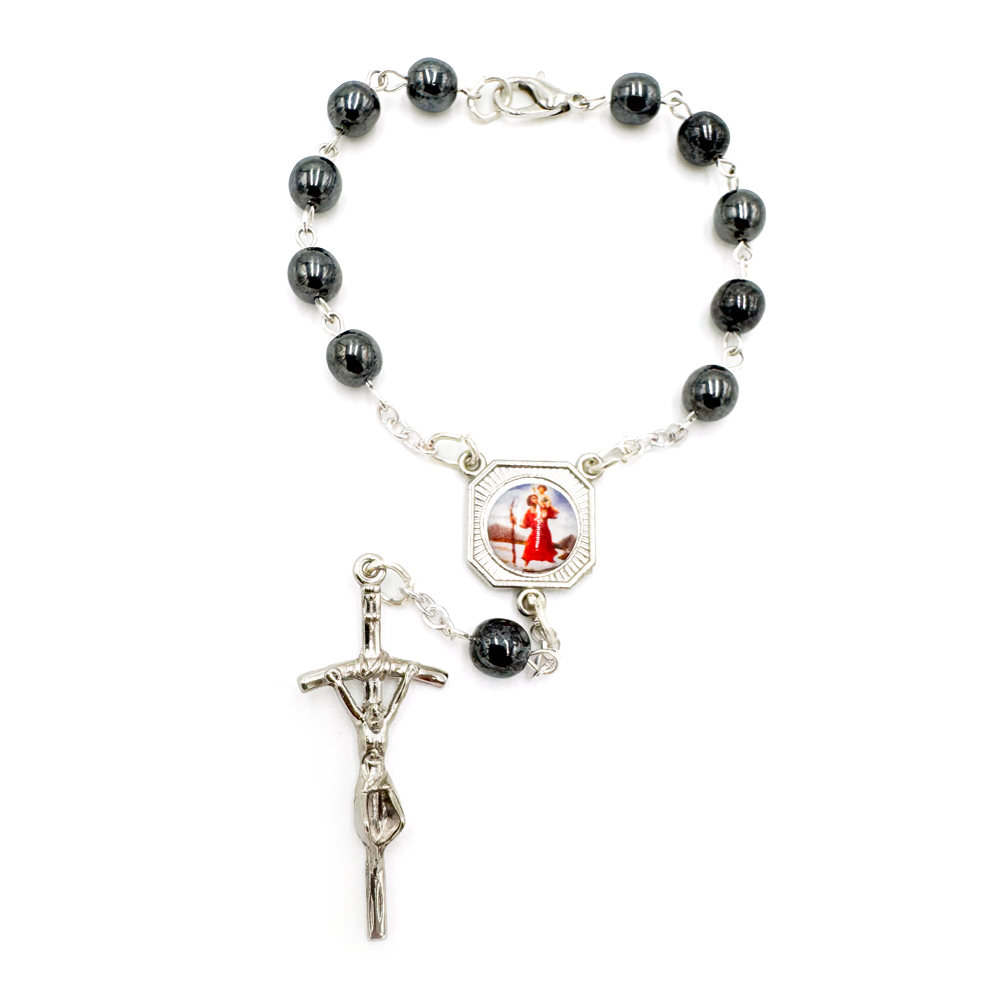 Kompaktowy różaniec o długości 17 cm z hematytowymi koralikami 6 mm, krzyżykiem 3,5 x 1,5 cm oraz dwustronnym medalikiem (Św. Krzysztof / Serce Pana Jezusa). Wyposażony w zapięcie, idealny do noszenia na nadgarstku jako talizman ochronny i modlitewny.