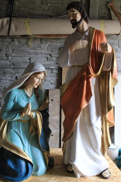 Komplet 3 figur odlanych z trwałej żywicy, malowanych w naturalne barwy. Najwyższa postać ma 160 cm, a całość tworzy elegancką i harmonijną scenę Bożego Narodzenia.