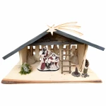 Szopka bożonarodzeniowa drewniana z oświetleniem i ogniskiem + Św. Rodzina 20 cm - dach drewniany