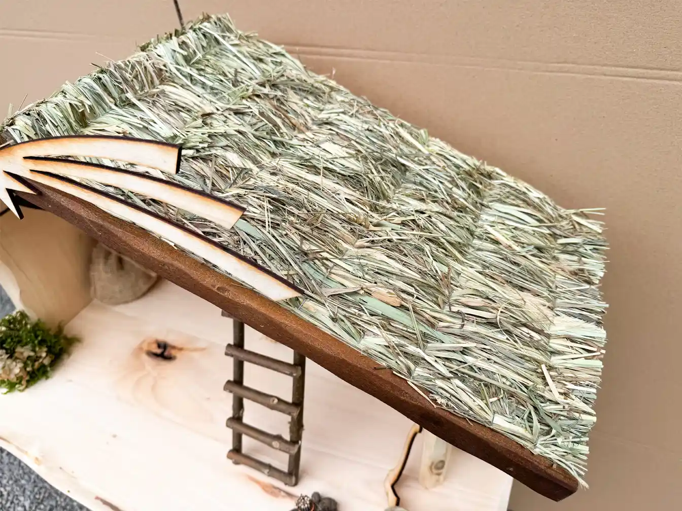 Szopka bożonarodzeniowa drewniana z oświetleniem i ogniskiem + figury 21 cm - dach z siana