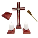 Komplet wykonany z naturalnego drewna w kolorze wiśniowym. W skład zestawu wchodzi krzyż, kropidło, świeczki z podstawkami oraz kropielnica. Krzyż ma 22 cm wysokości, a pozostałe elementy są proporcjonalnie dopasowane, tworząc elegancki i klasyczny zestaw kolędowy.